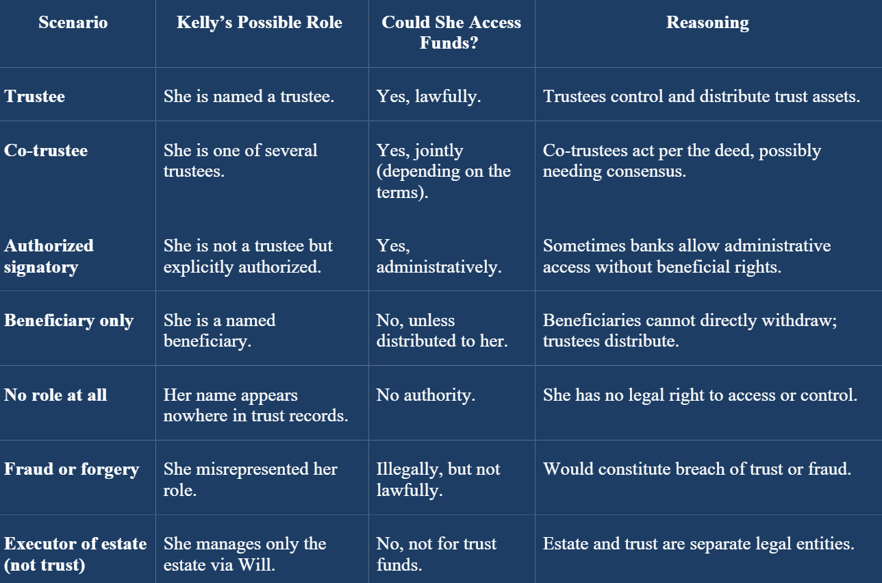 If Kelly is not the trustee or authorized signatory, she cannot legally withdraw or control trust assets.